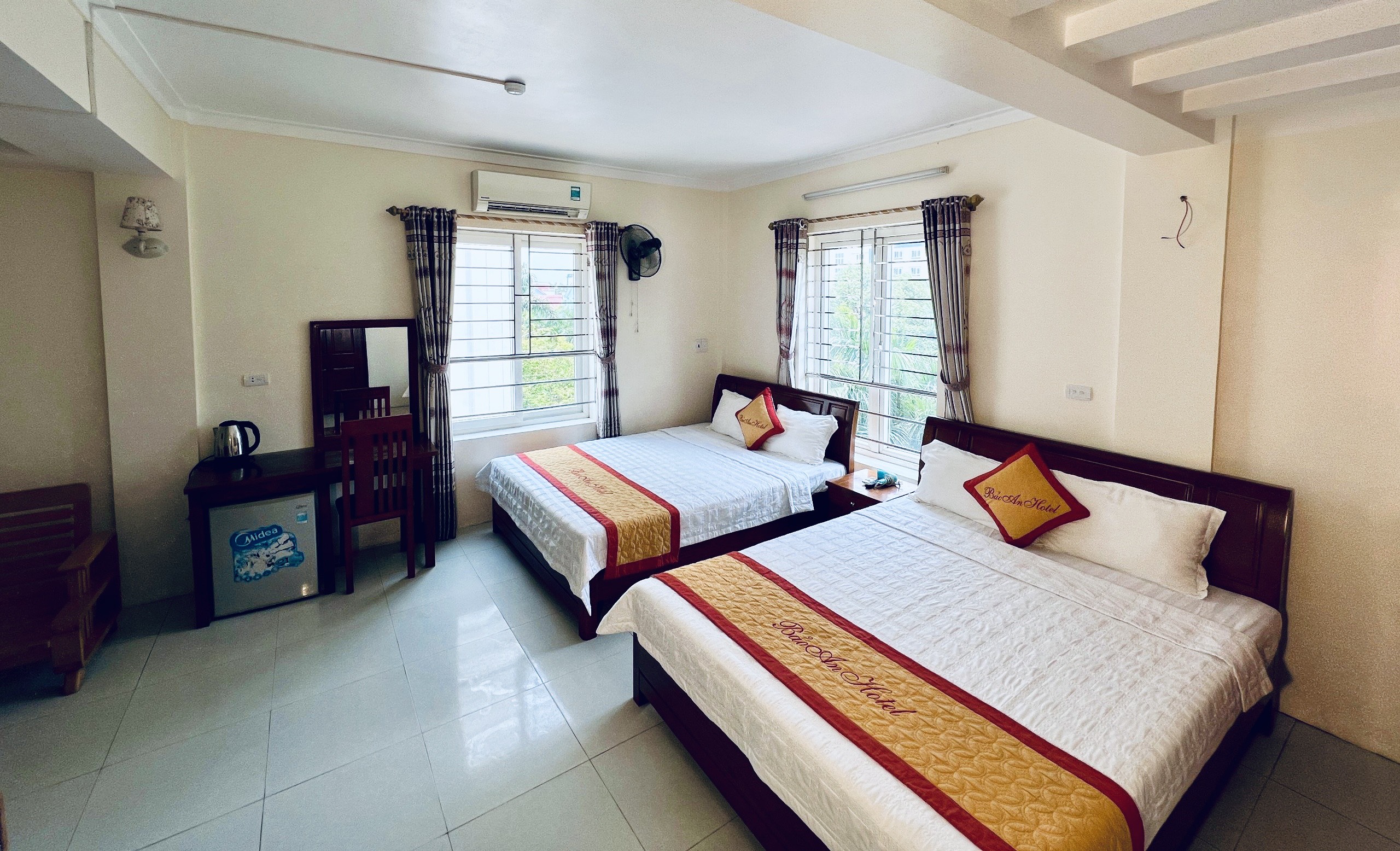 BẢO AN Hotel được xây dựng ngay trước biển. Các phòng được trang trí đẹp và tiện nghi đầy đủ như Điều hoà, tủ lạnh, tivi, bình nóng lạnh, tủ quần áo, bàn nước, máy sấy tóc, ấm siêu tốc,…..,